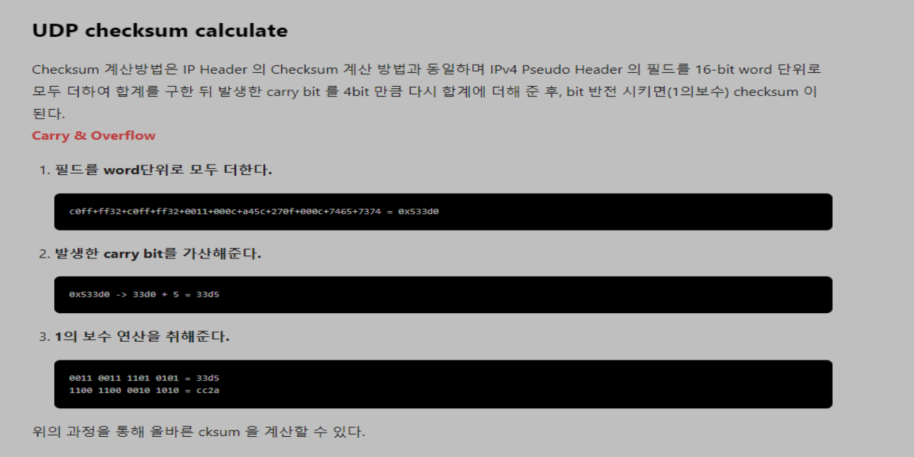 - IP Header 와 UDP header에 있는 일부 정보들을 가져와 IPv4 Pseudo Header 를 만든 후에 계산해 줘야 한다.