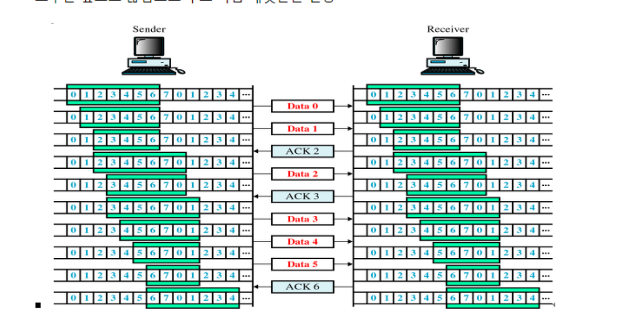 - 만약 윈도우 크기가 3이면 ACK가 돌아올 때까지 3개까지의 메시지를 동시에 보낼 수 있는 것이다.