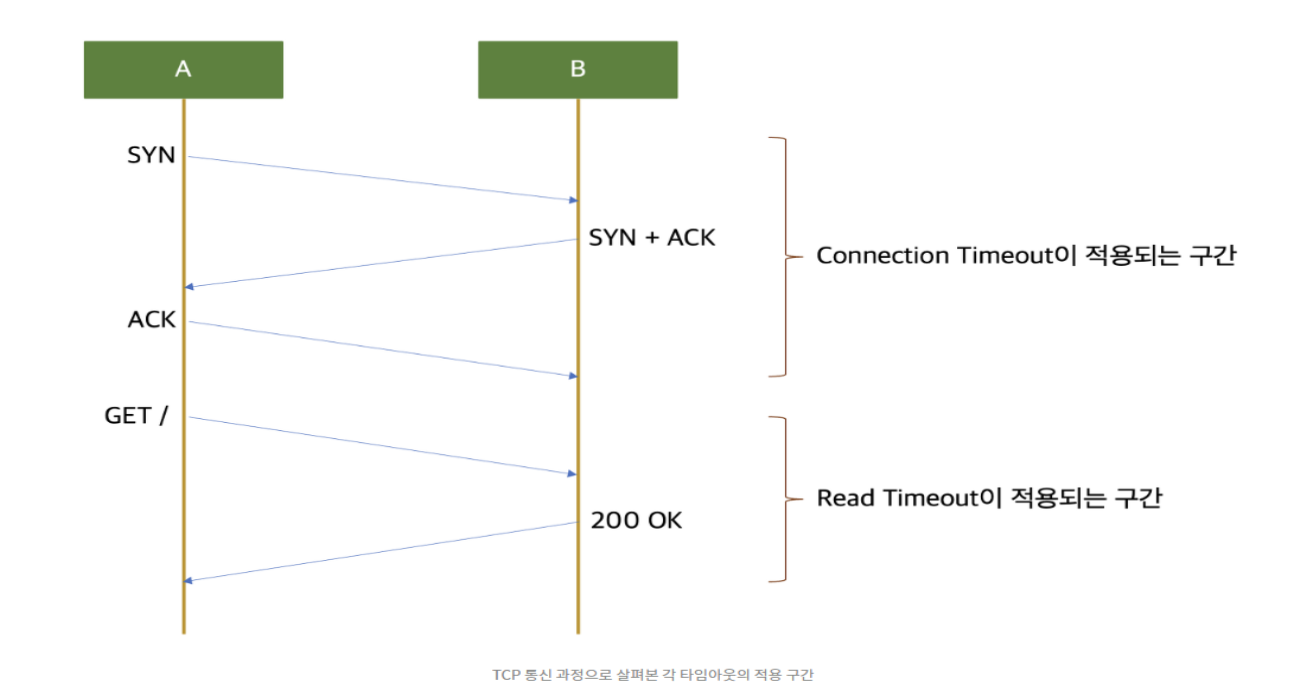 - https://alden-kang.tistory.com/m/20#:~:text=%EB%A8%BC%EC%A0%80%20Connection%20Timeout%EC%9D%80%20%EC%A2%85%EB%8B%A8,%EC%82%AC%EC%9A%A9%EB%90%98%EB%8A%94%20%ED%83%80%EC%9E%84%EC%95%84%EC%9B%83%20%EC%9E%85%EB%8B%88%EB%8B%A4 - connection/read timeout